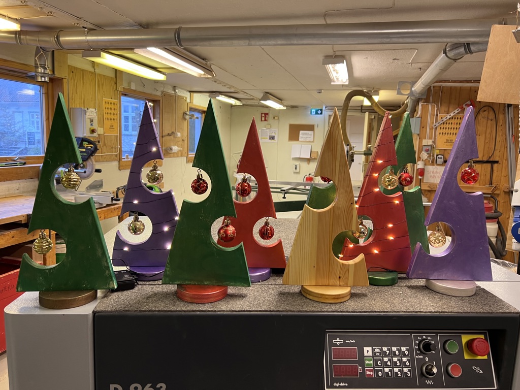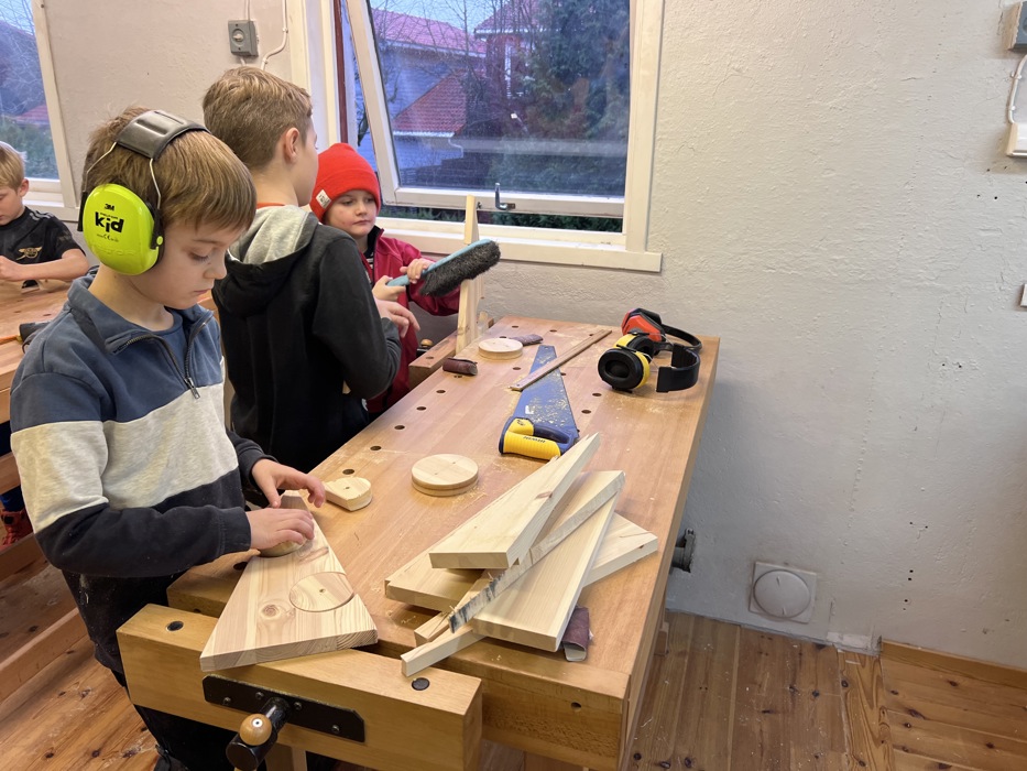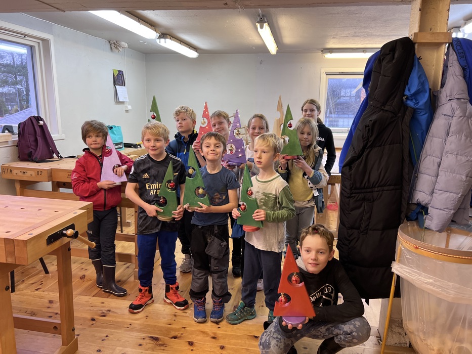 Det var høylytt og god stemning på lendeverkstedet når 11 barn, saget, pusset og drillet for å lage seg juletrær.